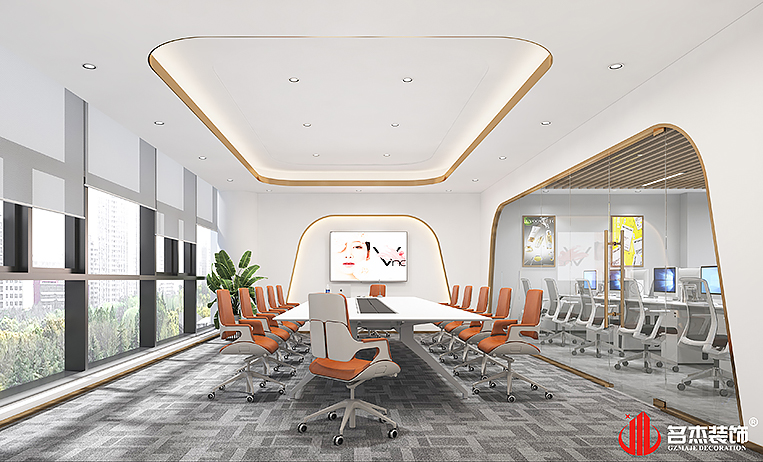 在整個的辦公室裝修設計當中,主要的空間采用土豪金和活力橙作為空間的點綴色,讓空間的設計感層層遞進。同時時尚流行的風格是非常符合化妝品這個行業的,能夠重點突出產品的特點以及特色,使得產品變得更加吸引人。